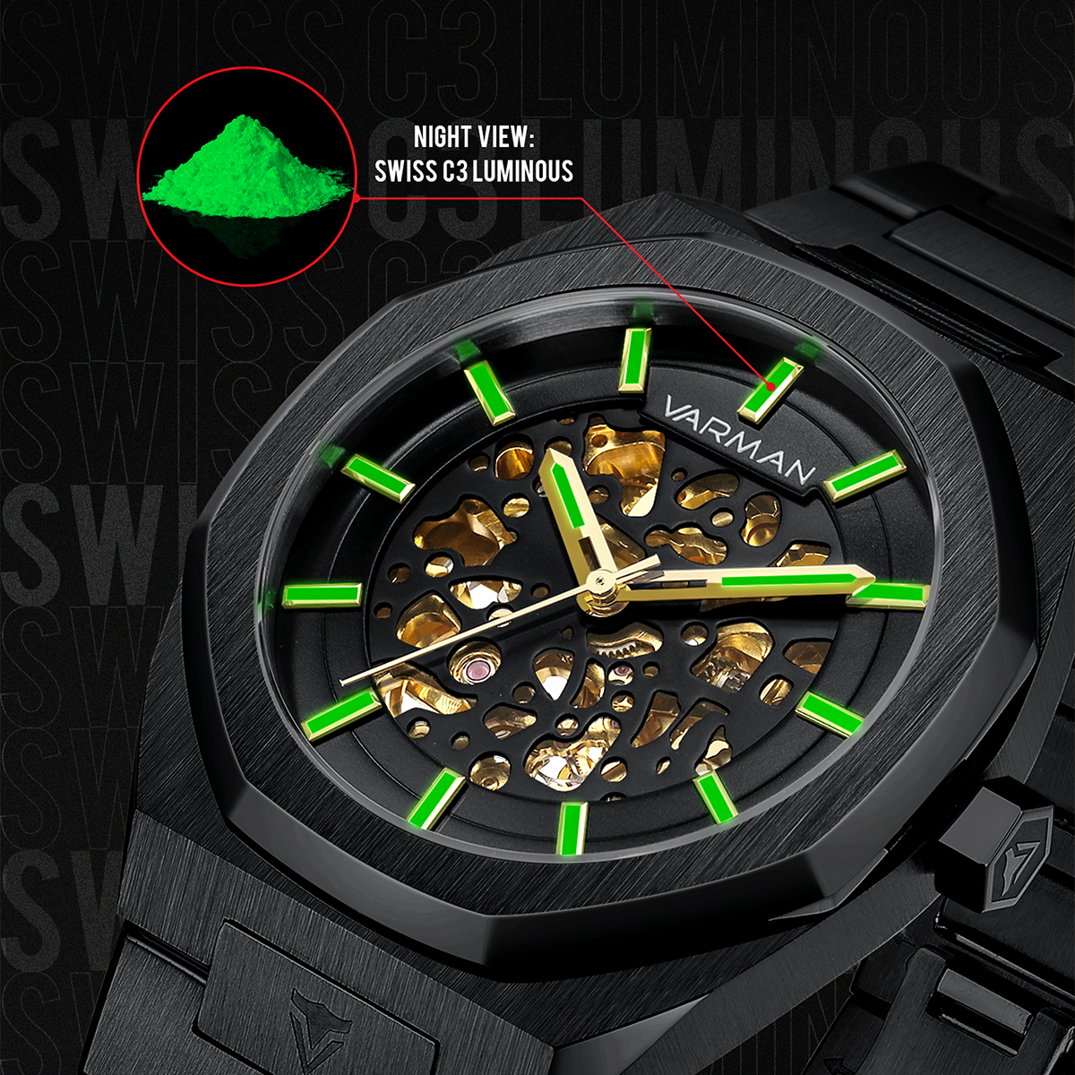 Swiss night view function has added to ensuring clear readability in low-light settings. Luminescent hands and markers add a touch of sophistication to your nighttime ensemble. Elevate your wristwear with this sleek and functional timepiece, perfect for every moment, day or night.